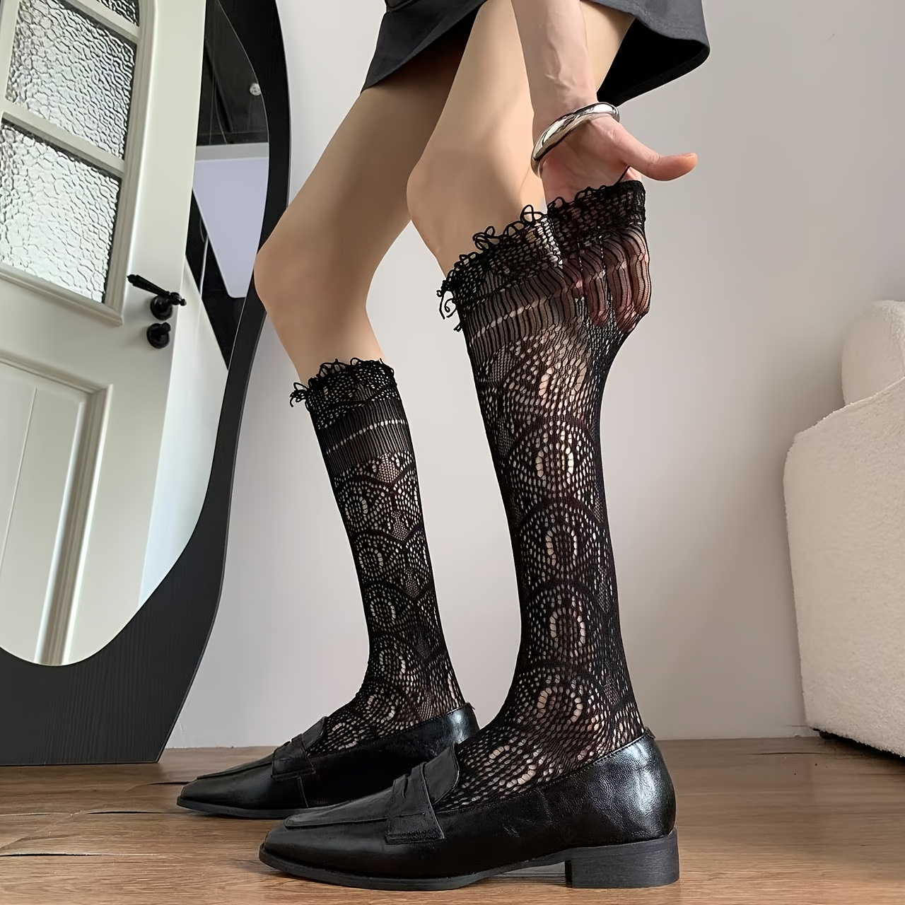 TEMU 리리 디자인의 레트로 하이-필 프린지 컷아웃 니하이 양말 한 쌍