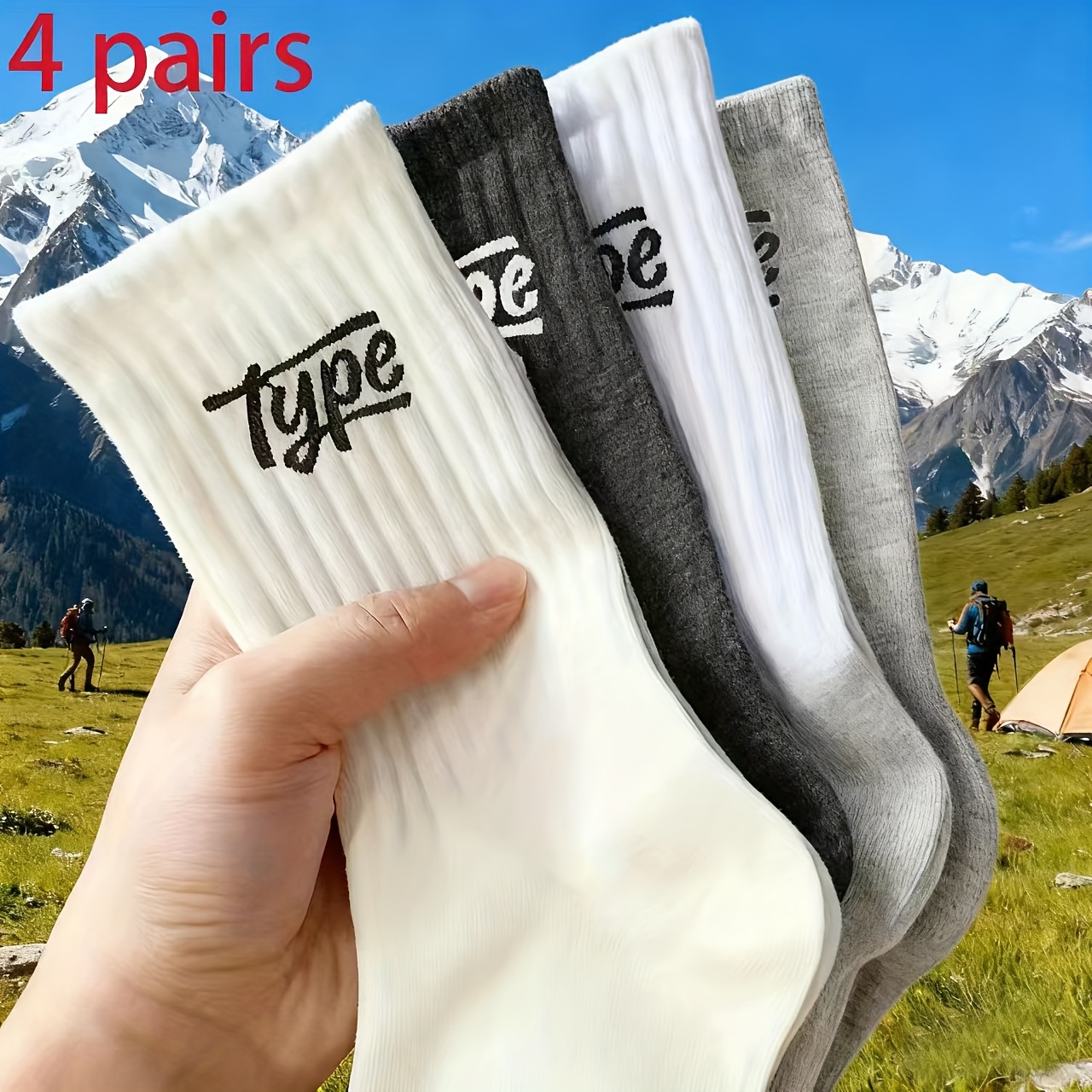 TEMU 남성용 두꺼운 미드-카프 운동 양말 4켤레 - 튼튼한 겨울용 보온, 통기성 및 탄성, 흰색 바탕에 검은색 글자, 남녀공용, 하이킹, 헬스장, 내구성 있는 원단 구조, 세련된 디자인, 야외 활동, 캐주얼 웨어 - 이상적인 선물