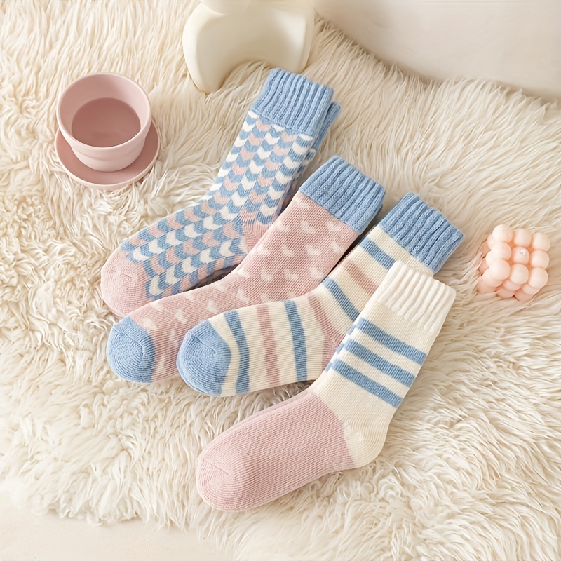 TEMU 여성용 두꺼운 겨울 따뜻한 기모 안감 미드-카프 양말 4켤레 - 부드러운 플러시 소재, 하트 패턴, 블루 & & 물방울 무늬