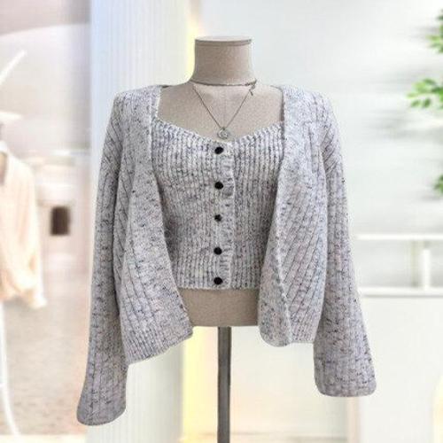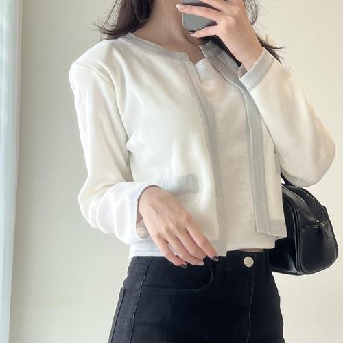 [옷자락]여자 어깨패드 노버튼 크롭 가디건 배색 끈나시 세트