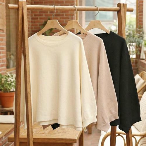 [옷자락]여성 봄 간절기 캐주얼 라운드넥 루즈핏 가오리 니트 티셔츠
