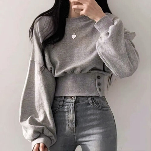 [옷자락] 여성 힙무드 허리버튼 시보리 맨투맨 가오리핏