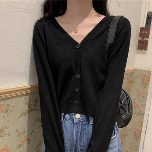 [셀러허브_여성트랜드패션]ONM 가을 루즈핏 브이넥 얇은 긴팔 여성 숏 크롭 가