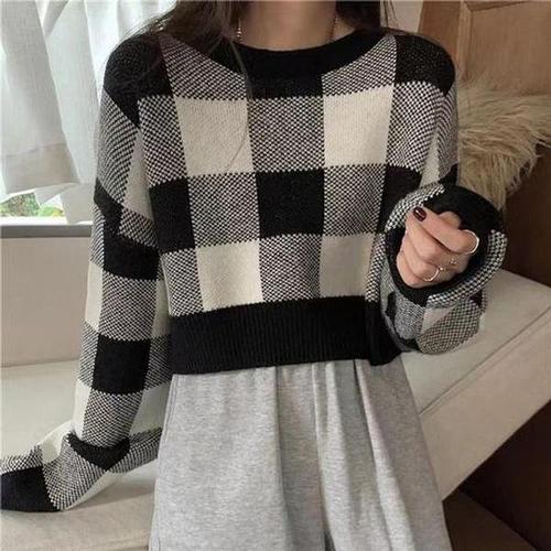 [에이치플러스몰]여성 모던한 체크 패턴 가을 크롭 티셔츠 LK K013 티 가을티셔츠 캐주얼티셔츠 스웨터 ..