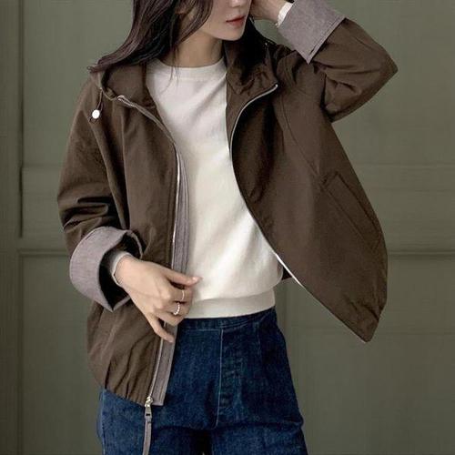 [신상오픈런]여성 가을 후드집업 배색 롤업 하이넥 스트링 자켓