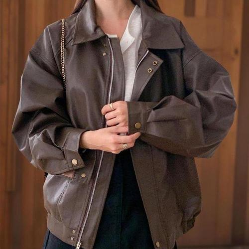 [신상오픈런]여성용 가을 카라넥 오버핏 집업 가죽 자켓