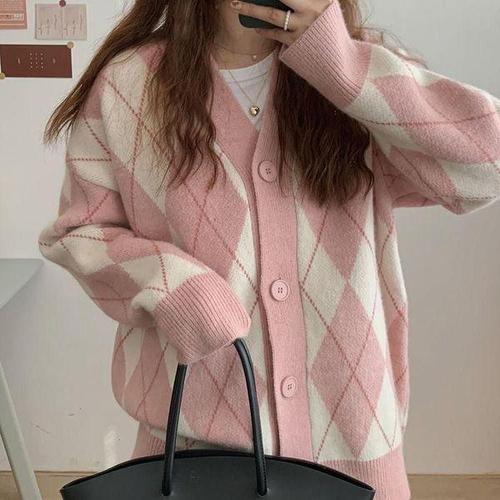 [에이치플러스몰]아가일 롱 가디건 봄가을아우터 심플 루즈핏 외