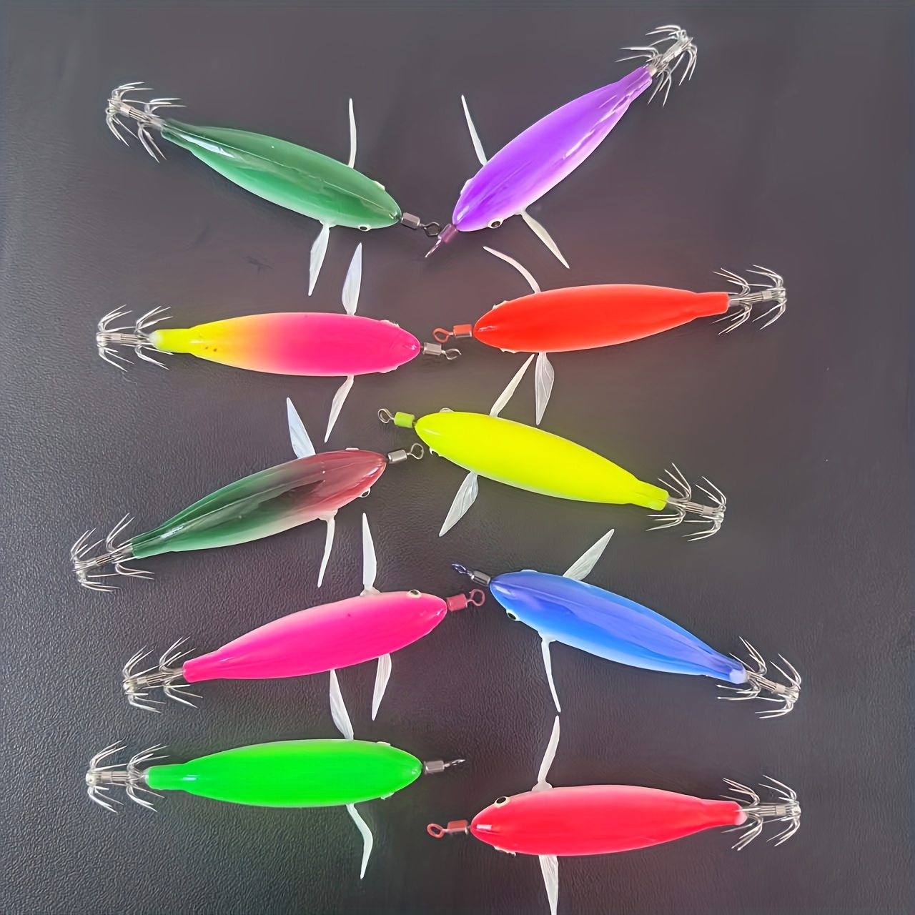 TEMU 10개 스테인리스 스틸 야광 오징어 훅 - 내구성 강한 바다 및 민물 낚시 루어, 다색 야간 미끼 (녹색, 분홍색, 빨간색, 노란색) - 오징어, 새우, 농어, 송어, 파이크용 - 리얼리스틱 플로팅/라이징 루어