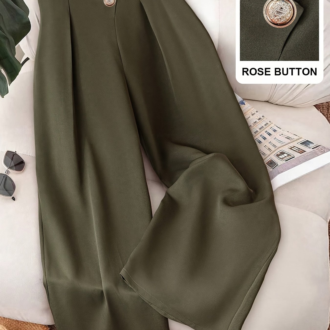 TEMU 가을 솔리드 컬러 버튼 패브릭 플리츠 장식 지퍼 오피스 빈티지 밀리터리 그린 팬츠 - 메탈 카멜리아 버클 & 크로스 웨이스트밴드 디자인