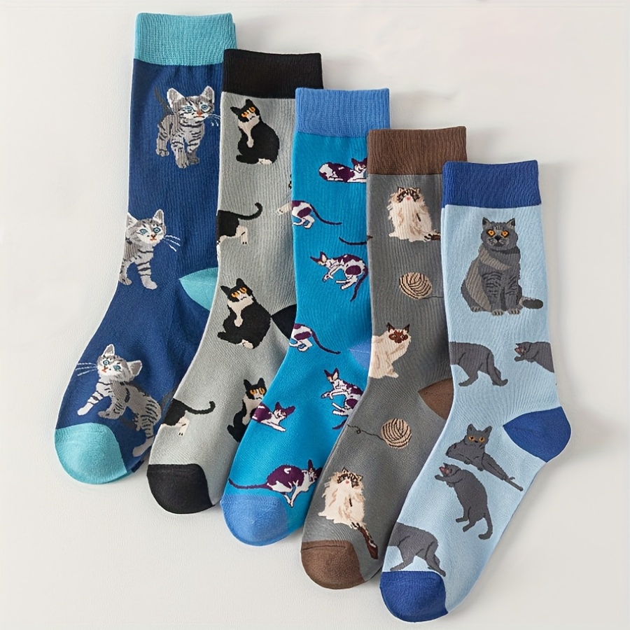 TEMU 5 쌍 여성용 중간 발목 양말 - 만화 동물 패턴 (고양이, 부엉이, 토끼) - 리브, 폴리에스터 및 스판덱스 블렌드, 가벼우며 통기성이 좋음 - 봄, 가을, 겨울용 - 캐주얼 스타일, 귀여운 양말