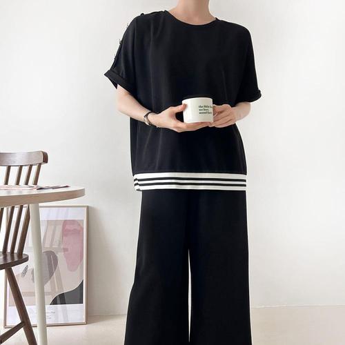 [신상오픈런]여성 대형 견장 블랙 반팔 티셔츠 와이드 팬츠 여름 세트
