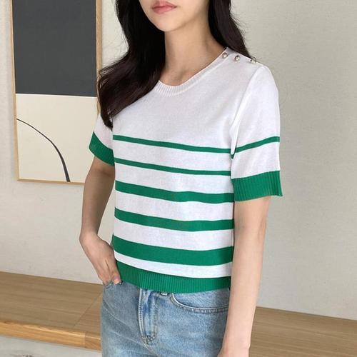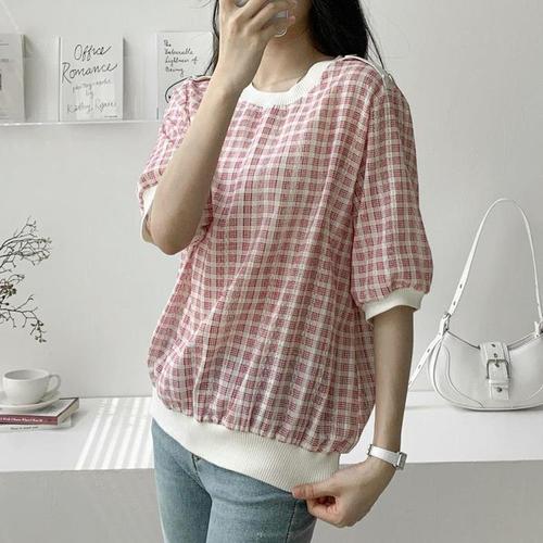 여자 체크반팔티 견장버튼 퍼프 배색 티셔츠