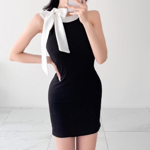 [옷자락]여성 홀터넥 스카프 골지 슬림핏 나시 미니 원피스