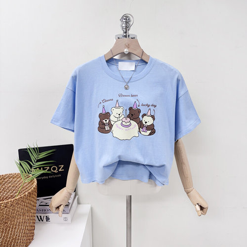 미즈큐즈 / 생축 귀여운 곰돌이 네마리 프린팅 크롭 반팔티 3colo