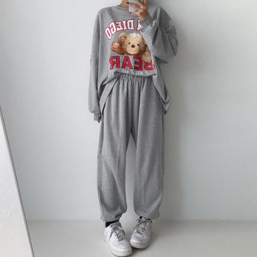 [유야]여성 면 곰돌이 맨투맨 티셔츠 조거팬츠 세트 -FPST0243- 봄 가을