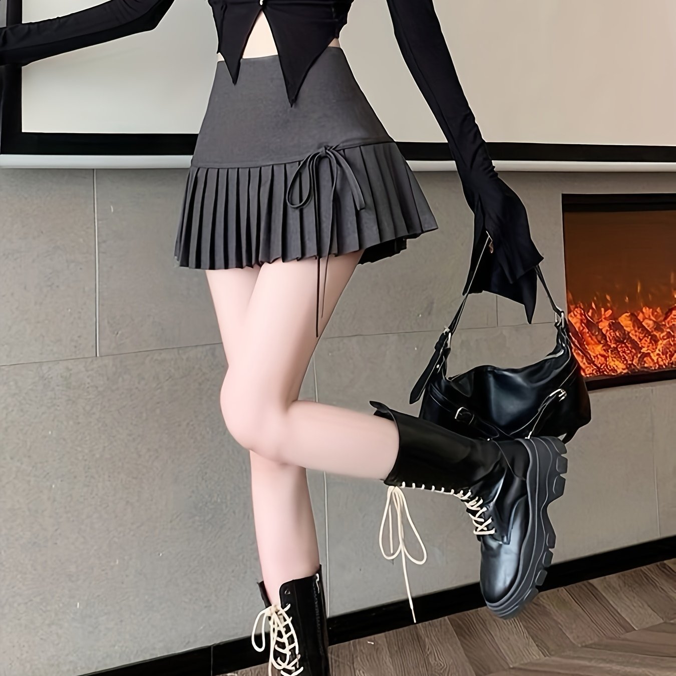 TEMU 가을 레이스업 하이웨이스트 슬림 A라인 플리츠 숏 스커트