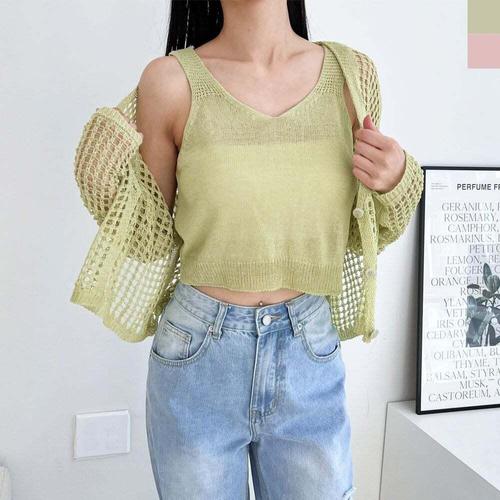 ONM 크롭 여성 가디건 그물 나시티 여자 가디건 세트 2색