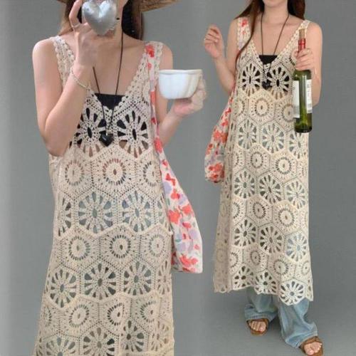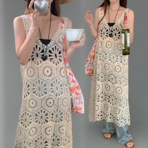 [미라클세븐]펀칭 그물 플라워 끈나시 휴양룩 옆트임 시스루원피스