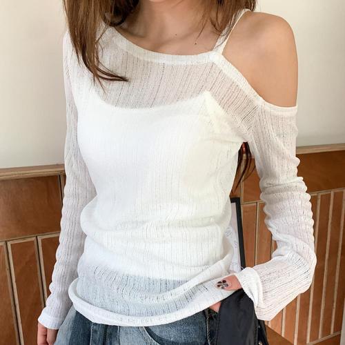 [옷자락]여성 시스루 썸머 그물 오프숄더 루즈핏 긴팔 니트