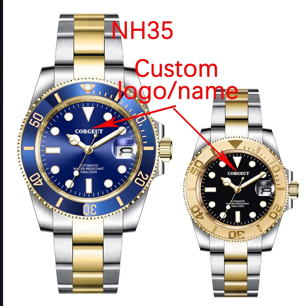 사용자 정의 일본 NH35 MIYOTA 8215 자동식 남성용 시계 2 톤 골드 스트랩 무균 블루 선버스트 다이얼 탑 브랜드 사파이어 크리스탈