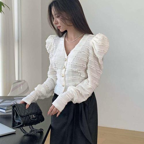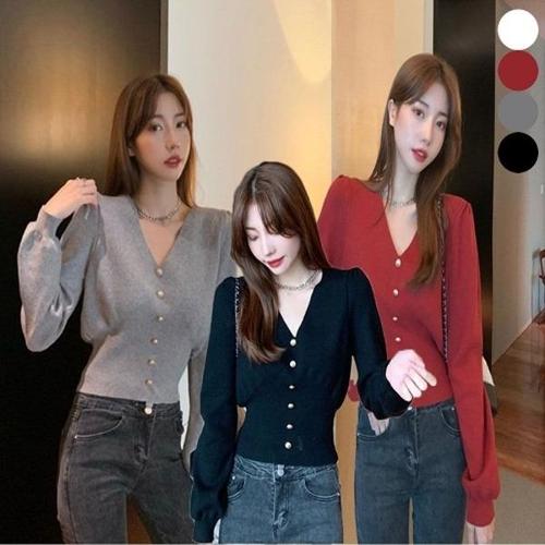 [엄지척]여자 퍼프 소매 v넥 금장 버튼 니트 가디건 티셔츠_19555686_667501