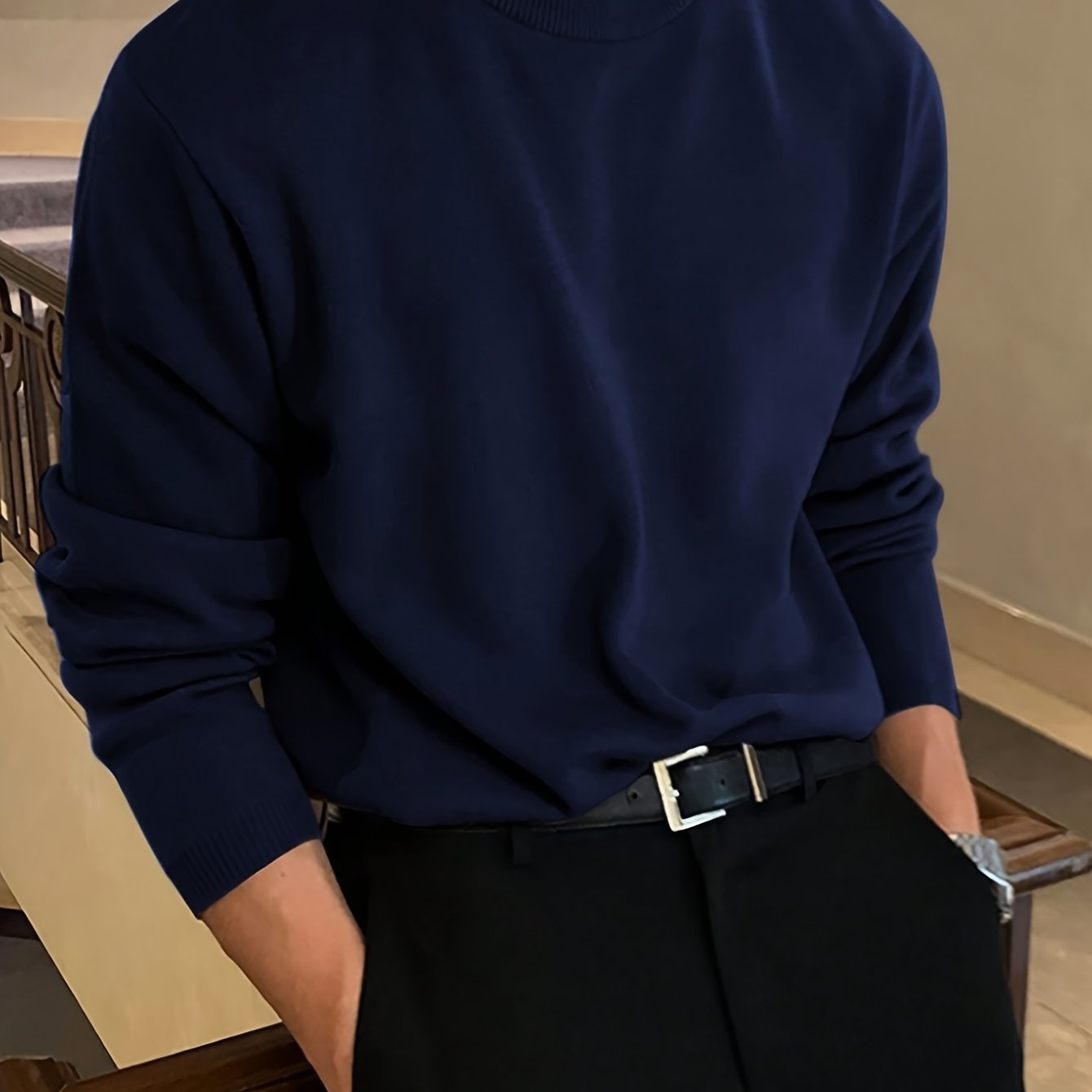TEMU JNBLDA 시크한 니트 스웨터, 남성용 캐주얼 따뜻한 스트레치 라운드넥 풀오버 스웨터, 가을 겨울용