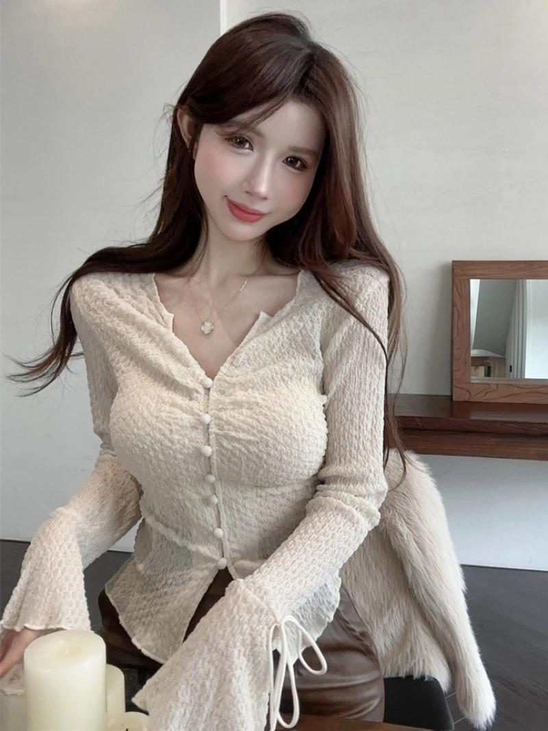 브이넥 긴팔 텍스처 벨티드 쉬폰 탑 여성용 봄 우아한 슬림핏 숏 이너웨어 베이스 오픈 가디건 탑