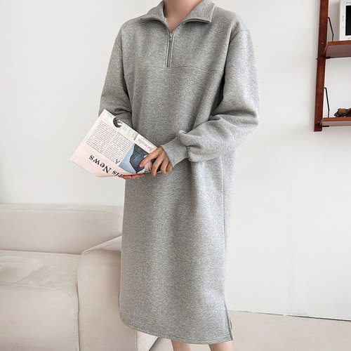 플러리싱 / 캐주얼 기모 반집업 트임 롱 원피스 플러리싱