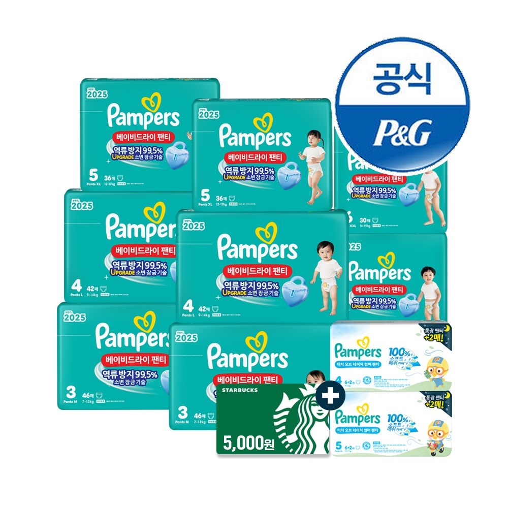 베이비드라이팬티 기저귀 5단계 36매x8팩(2박스)+스타벅스 5천원+체험팩 2팩증정