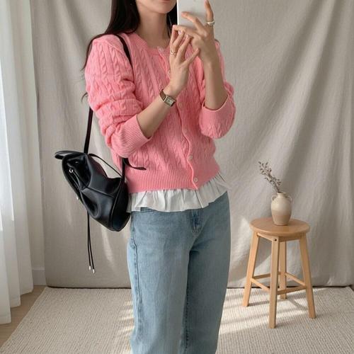 [옷자락] 여성 꽈배기 라운드넥 니트 가디건 7컬러 데일리 여리핏