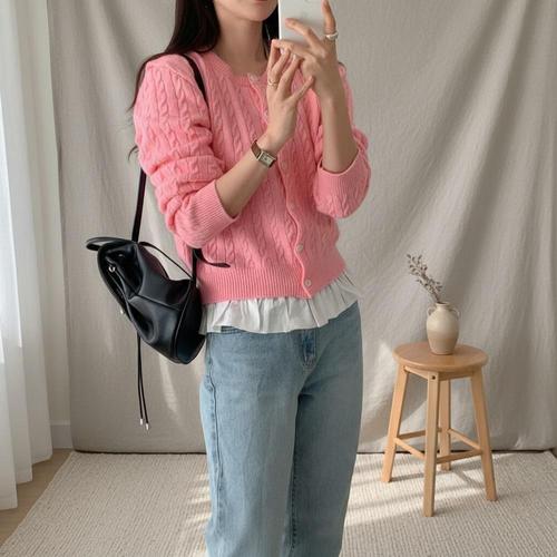 [셀럽하우스]로맨틱 YLXF9542 꽈배기 니트 라운드넥 핑크 탄탄한 가디건