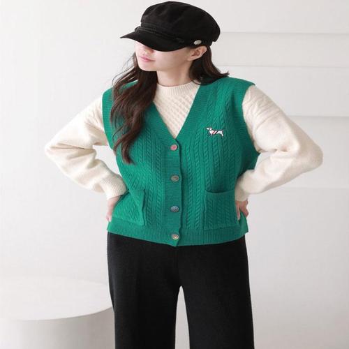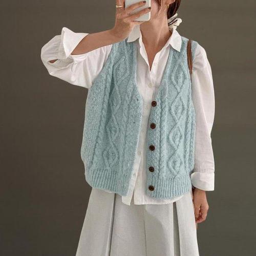 투니스 여성 빈티지 꽈배기 패턴 브이넥 소프트 니트 조끼