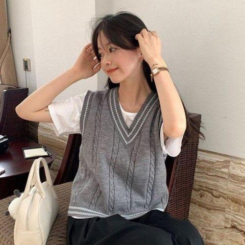 [에이치플러스몰]심플 여성 니트 조끼 여자 브이넥 꽈배기 니트 베스트