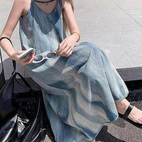 여자 봄 여름 가을 a라인 뷔스티에 민소매 끈나시 데님 청 롱원피스 간절기 썸머 등하원룩 나들이룩