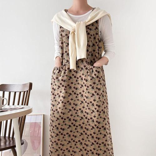 [옷자락] 여자 플라워 셔링포켓 버튼 나시 면 골덴 롱원피스