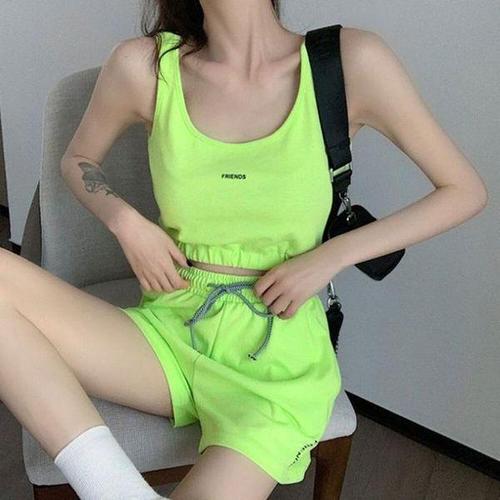 [셀러허브_여성트랜드패션]ONM 자수 레터링 크롭 나시 허리밴딩 반바지 상하세트