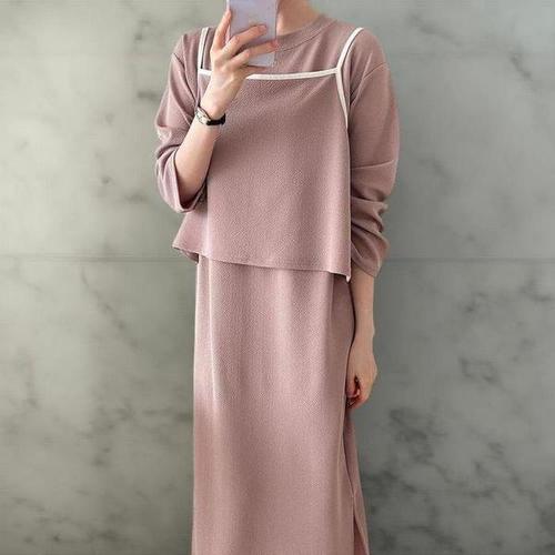 [옷자락]여성 레이어드 컬러 배색 나시 긴팔 롱드레스 세트