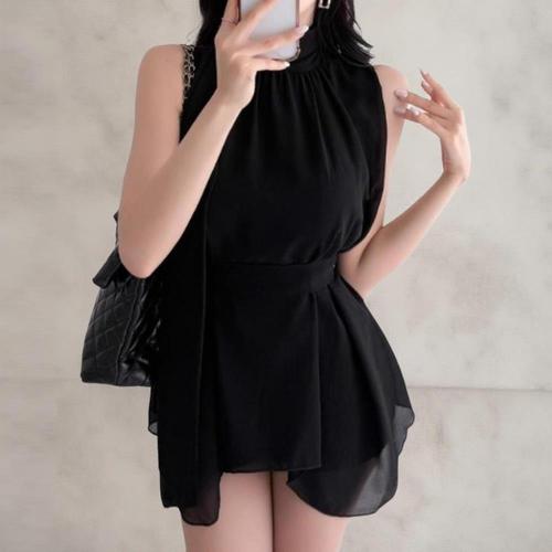 [신상오픈런]여성 민소매 쉬폰 블라우스 홀터넥 허리 스트랩 디자인