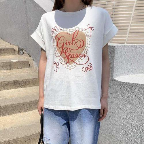 [신상오픈런]여성 캐주얼 하트 나염 면 롤업 루즈핏 반팔티