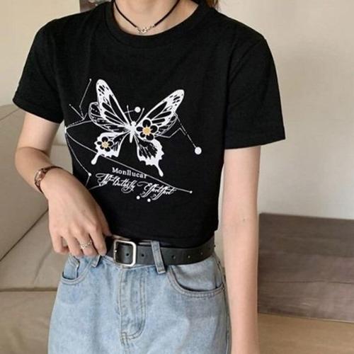 [다잇템_패션]여성 나염 U넥 키치무드 버터플라이 반팔티