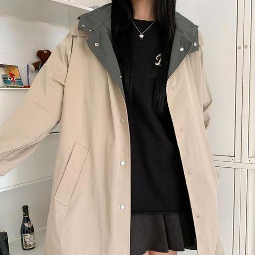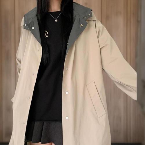 [신상오픈런]여성 나일론 혼합 바람막이 양면 후드 미디 점퍼