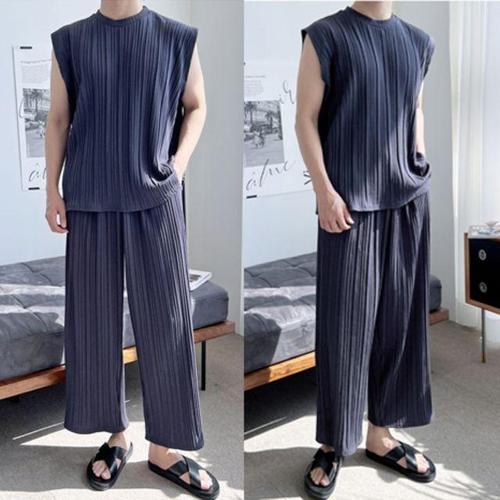 [모노무드]MMO 맞주름 시즌 프린트 강조 남성용 소매없음 와이드핏 스트랩트라우저 코디세트