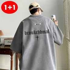AOUGK 1+1 남자 스웨이드 오버핏 반팔티 두꺼운 롱티 빅사이즈 라운드티 프린팅 반팔 티셔츠 데일리