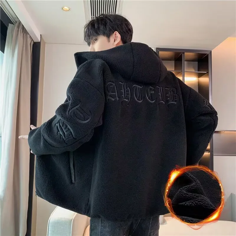 양털 벨벳 후드 재킷 남성용 두꺼운 가을 겨울 플리스 안감 오픈 가디건 캐주얼 루즈핏 청년 패션 단색