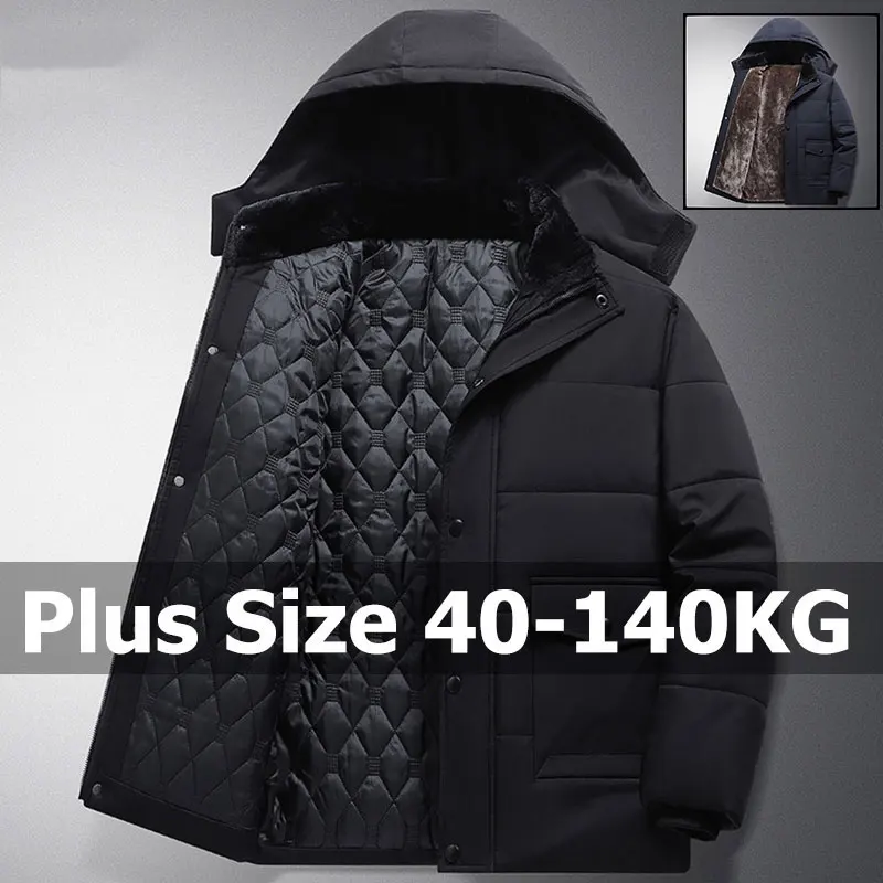두꺼운 면 재킷 남성 플러스 사이즈 M-8XL 겨울 따뜻한 캐주얼 롱 스타일 후드 포함 다용도 중년 남성 의류 140KG