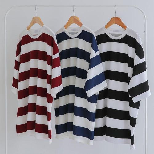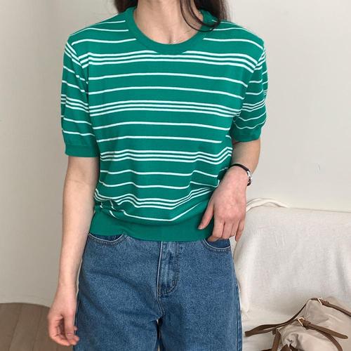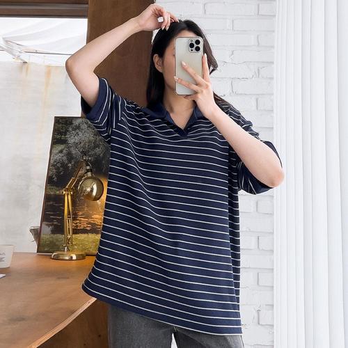 [샵앤][샵앤] 국산 여성 라운드넥 단가라 면100 반팔 니트 티셔츠 21DS-WKN-4386-네이비