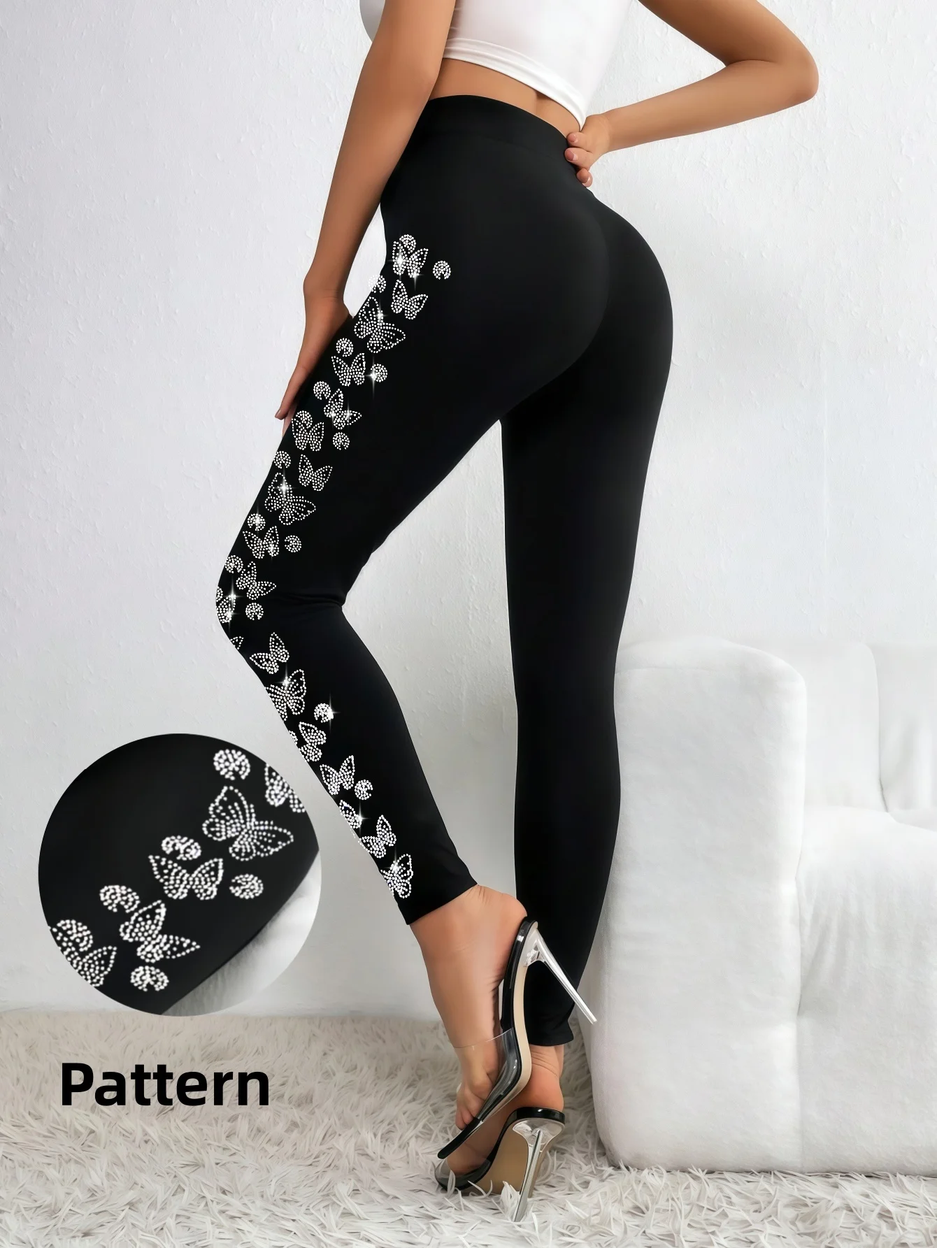 나비 측면 디자인의 여성용 블랙 레깅스, 하이 웨이스트 반짝이는 라인스톤 레깅스, 스트리트웨어에 어울리는 신축성 있는 패셔너블한 레깅스