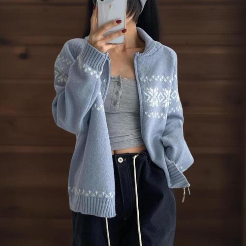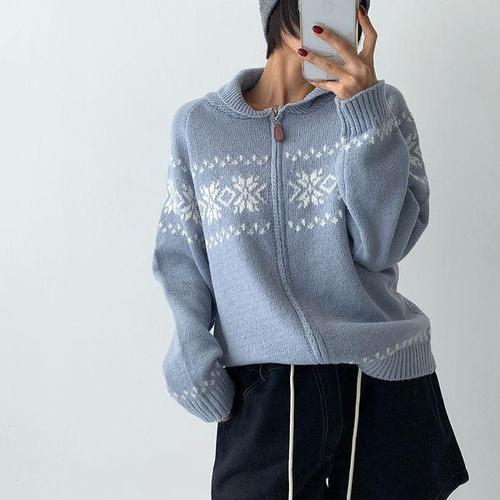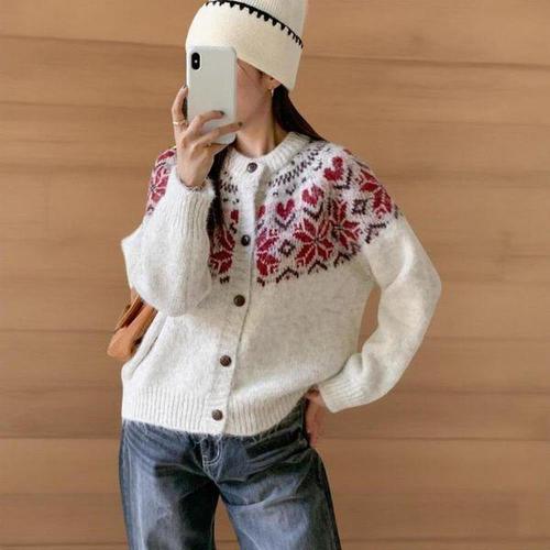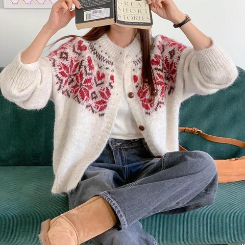[신상오픈런]여성용 하트 눈송이 패턴 노르딕 라운드 니트 가디건