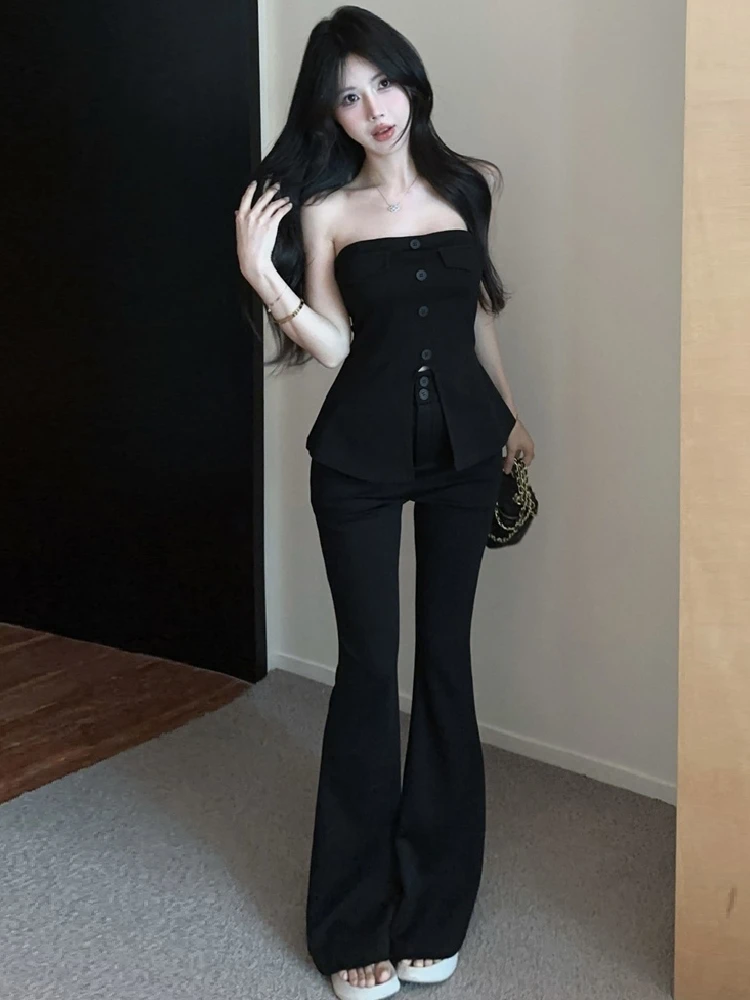 미국 핫걸 캐주얼 패션 투피스 세트 원숄더 디자인 허리 조임 스플릿 베스트 플레어 팬츠 앙상블 롱 팬츠