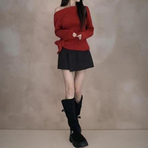 [다잇템][다잇템] 여성 원오프숄더 스트랩 울혼합 언발란스 리본 니트_23460876_588872